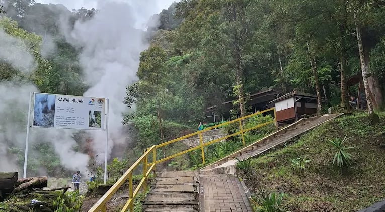 Bukan hujan dari langit, melainkan dari bumi. Rasakan sensasi relaksasi di tengah uap panas bumi yang mengalami kondensasi alami, menciptakan gerimis hangat yang tak pernah berhenti.